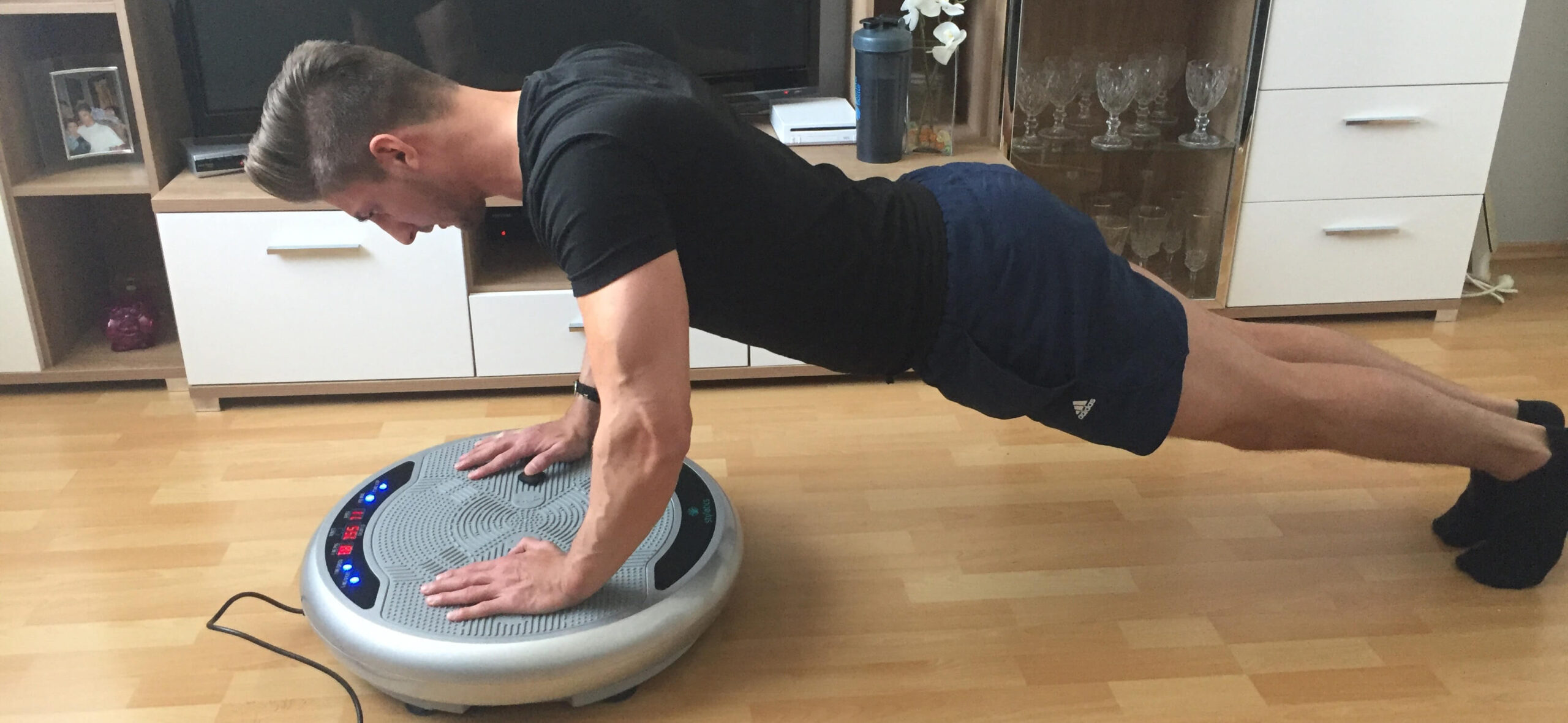 Liegestütze mit den Händen auf der vibrierenden Platte sind nochmal eine ganz andere Nummer als normale Liegestütze. Falls dir das zu schwer ist, kannst du auch gerne „Frauenliegestütze“ machen – auf den Knien statt auf den Füßen. Unterschätze das aber nicht!
